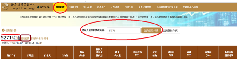3.「个股行情」查询输入证券代码 5271 再按「查询个股行情」即 可 (也可查询历史行情)。